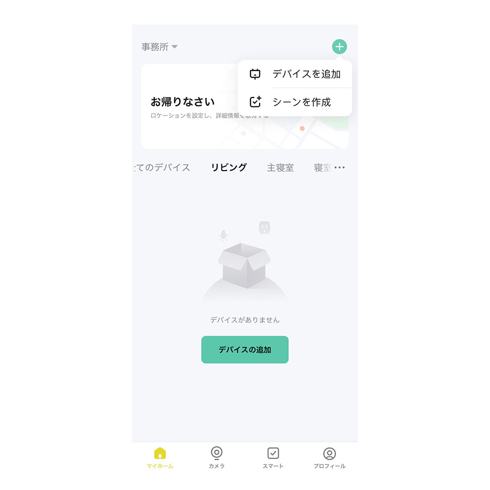 アプリにログインして、右上の「+」マークをタップして、その後「デバイスの追加」をタップします。